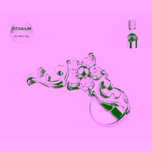 Acest piercing tip labret impresioneaza printr-un design artistic si sofisticat, realizat din titan de calitate superioara (ASTM F136), ideal pentru pielea sensibila. Partea frontala este decorata cu un aranjament de cristale zirconia dispuse in forma florala, completate de detalii ornamentale fluide, ce ofera un aspect elegant si rafinat.