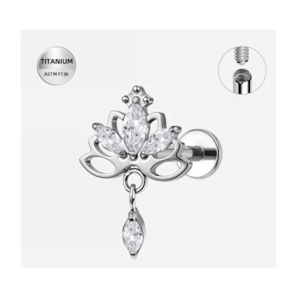 Piercing labret realizat din titan ASTM F136, placat in nuanta argintie, cu un design sofisticat inspirat din motive regale si florale. Partea frontala este decorata cu cristale tip marquise (in forma de frunza), dispuse simetric intr-un model elegant, ce ofera un efect rafinat si feminin.