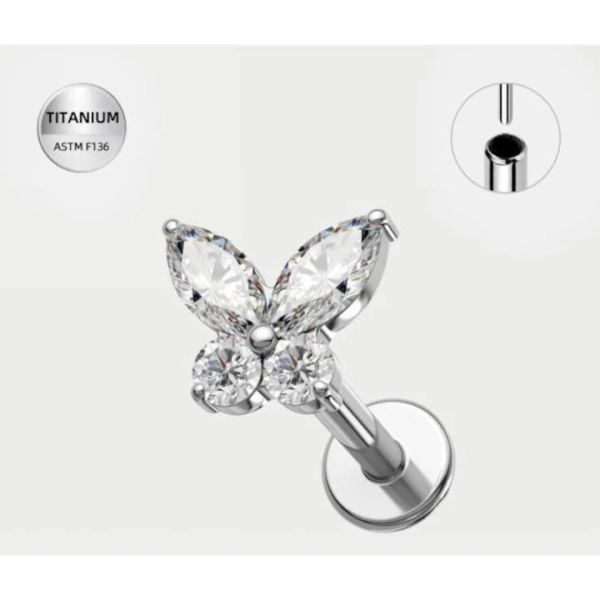 Piercing labret argintiu din titan cu fluture din cristale– 1.2 × 8 mm