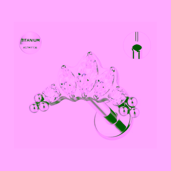 Piercing labret premium realizat din titan ASTM F136, placat in nuanta argintie, cu un design sofisticat inspirat din forme naturale. Partea frontala este decorata cu mai multe cristale tip marquise (in forma de frunza), dispuse armonios pe o baza curbata, oferind un efect elegant si rafinat.