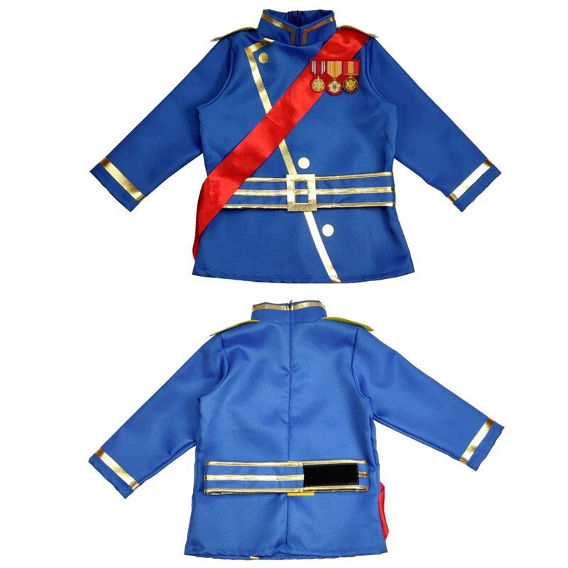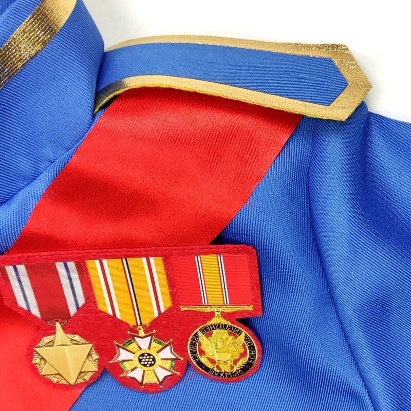Sacoul are detalii aurii decorative, epoleti pe umeri si o banda rosie diagonala, care ofera un aspect nobil si impunator. In partea pieptului sunt aplicate medalii si decoratii regale, ce completeaza perfect stilul princiar.
