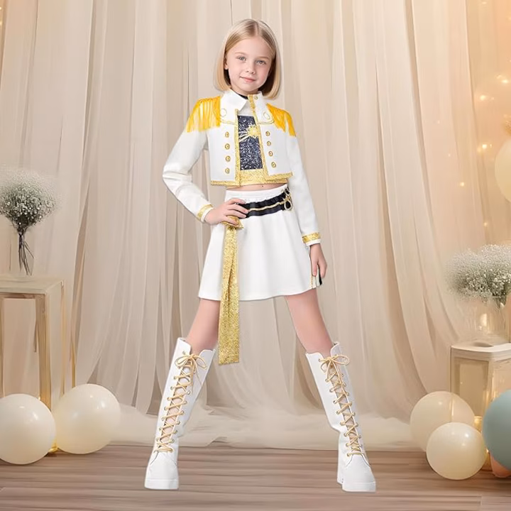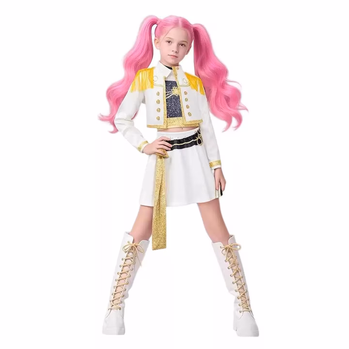 Costumul Mira este o tinuta moderna si eleganta inspirata din stilul energic al vedetelor K-POP, perfecta pentru spectacole, carnaval, petreceri tematice sau sesiuni foto. Designul sau atragator combina eleganta culorii albe cu accente aurii stralucitoare, oferind un look de scena plin de personalitate.