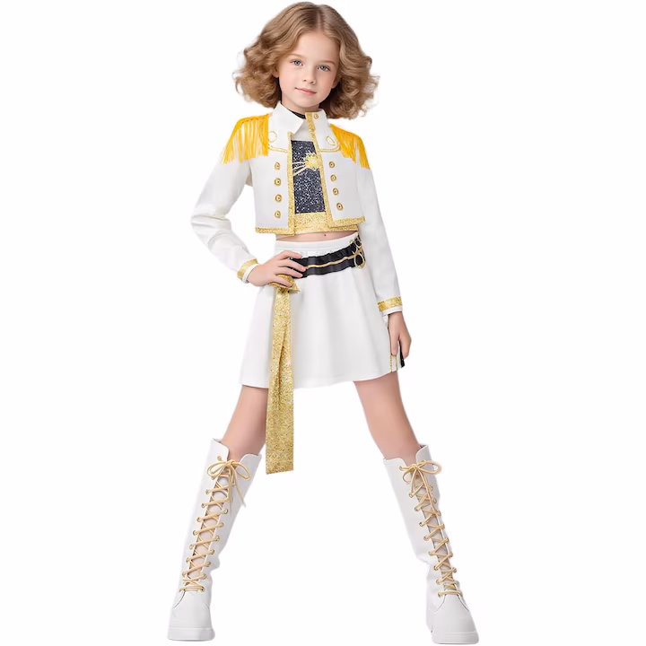 Tinuta este compusa dintr-o jacheta scurta alba cu epoleti aurii decorativi si nasturi aurii, care ofera un aspect stilizat de uniforma de scena. Sub jacheta se afla un top cu detaliu glitter auriu ce adauga un plus de stralucire. Fusta alba evazata este completata de o curea neagra cu elemente metalice si o panglica lunga aurie care evidentiaza tinuta.