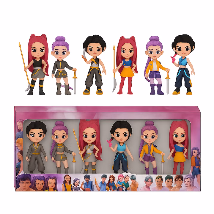 Acest set contine sase figurine inspirate din universul K-POP Demon Hunters, prezentate atat individual, cat si in cutia lor originala. Fiecare personaj are un look distinct, cu tinute colorate, arme tematice si coafuri vibrante, specifice stilului anime-fantasy.