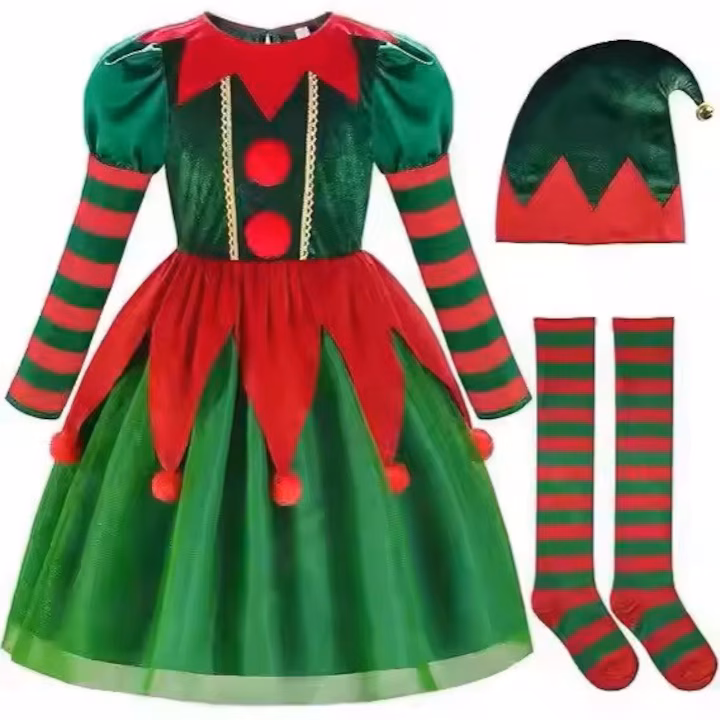 Costum Craciun fete Spiridusa, rochie, caciula si ciorapi