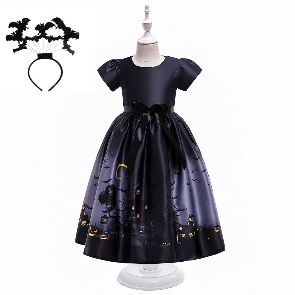 Costum Halloween fete Regina Liliac eleganta contine rochie din tafta cu jupa si cordon, bentita cu lilieci.