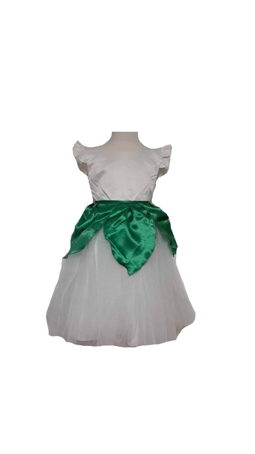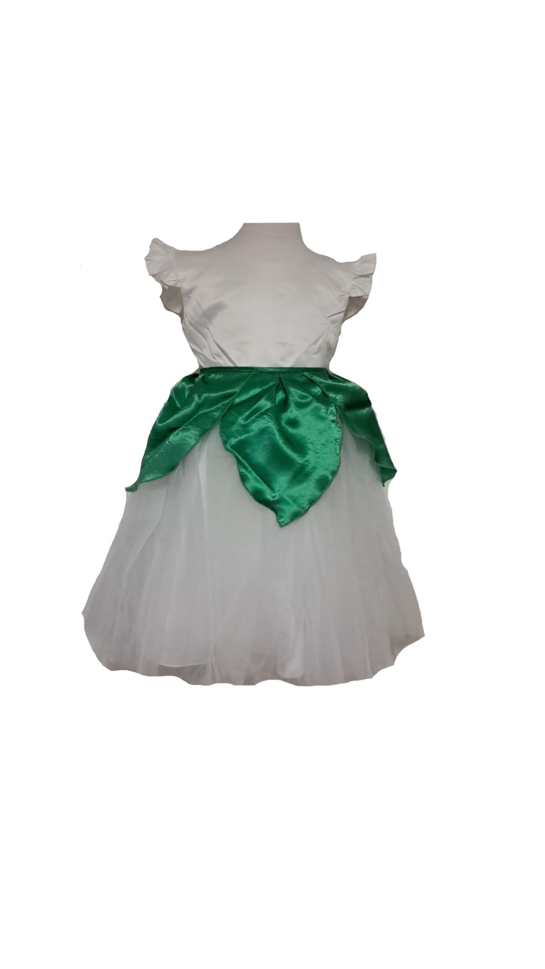 Costumatie serbare fete Ghiocel contine rochie din tafta si tul , brau verde cu petale.Braul poate fi asezat la la gat sau in talie.