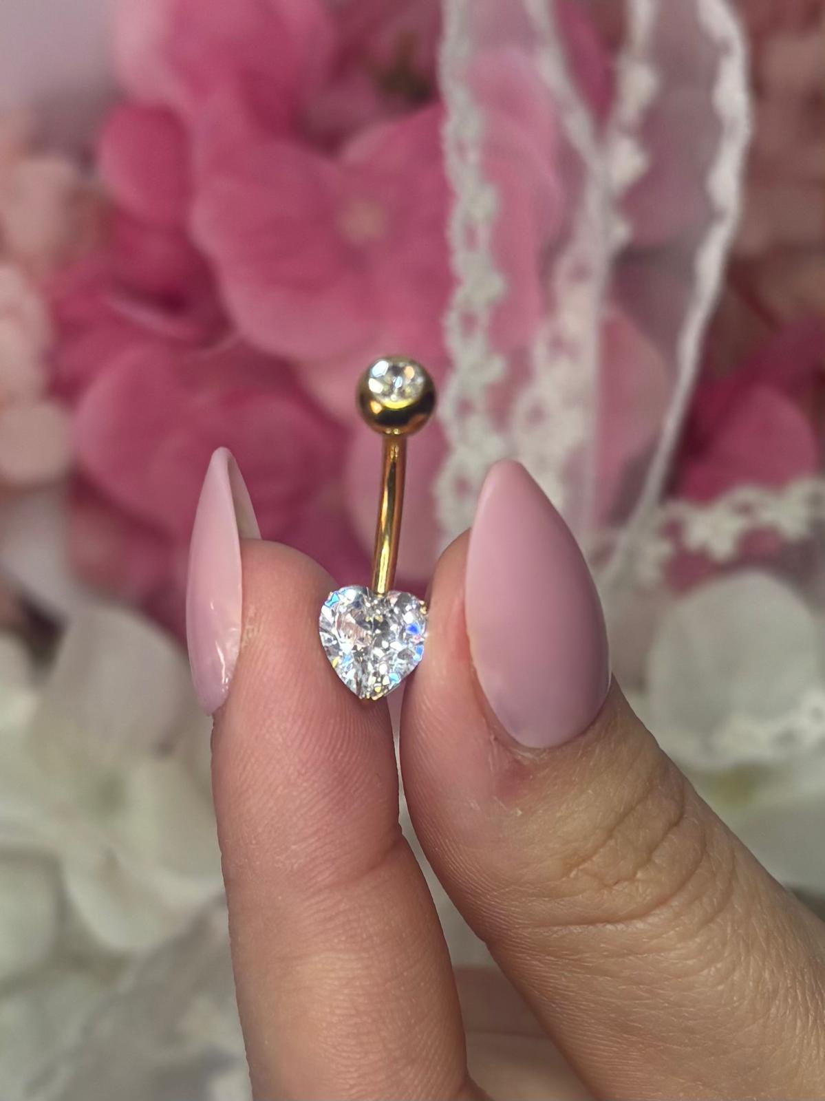 Piercing elegant pentru buric, realizat din titan de înaltă calitate (ASTM F136), cunoscut pentru rezistența sa și compatibilitatea excelentă cu pielea. Designul rafinat este evidențiat de un cristal zirconia strălucitor în partea superioară și un pandantiv în formă de inimă, decorat cu o piatră transparentă care captează lumina și oferă un aspect delicat și feminin.