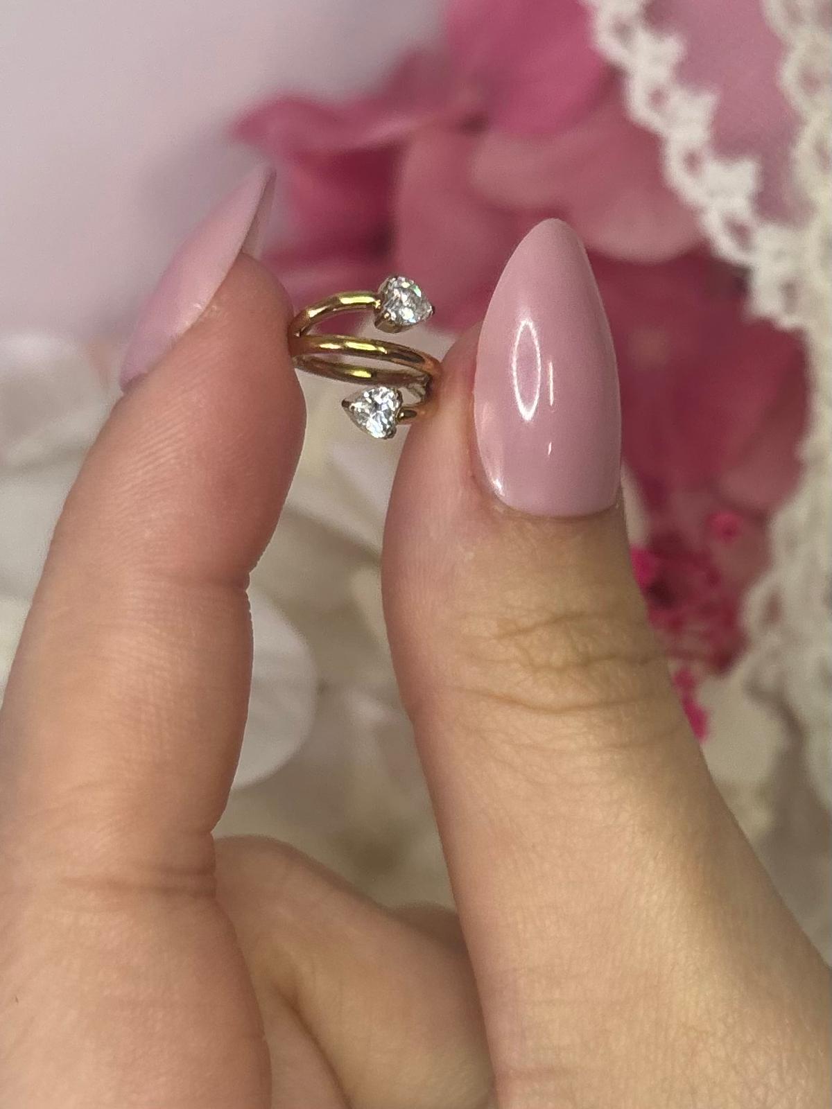 Acest piercing deosebit tip inel dublu (double hoop) este realizat din titan de înaltă calitate (ASTM F136), fiind perfect pentru pielea sensibilă. Designul său unic include două inele unite, decorate cu două pietre zirconia în formă de inimă, oferind un look modern, feminin și romantic.