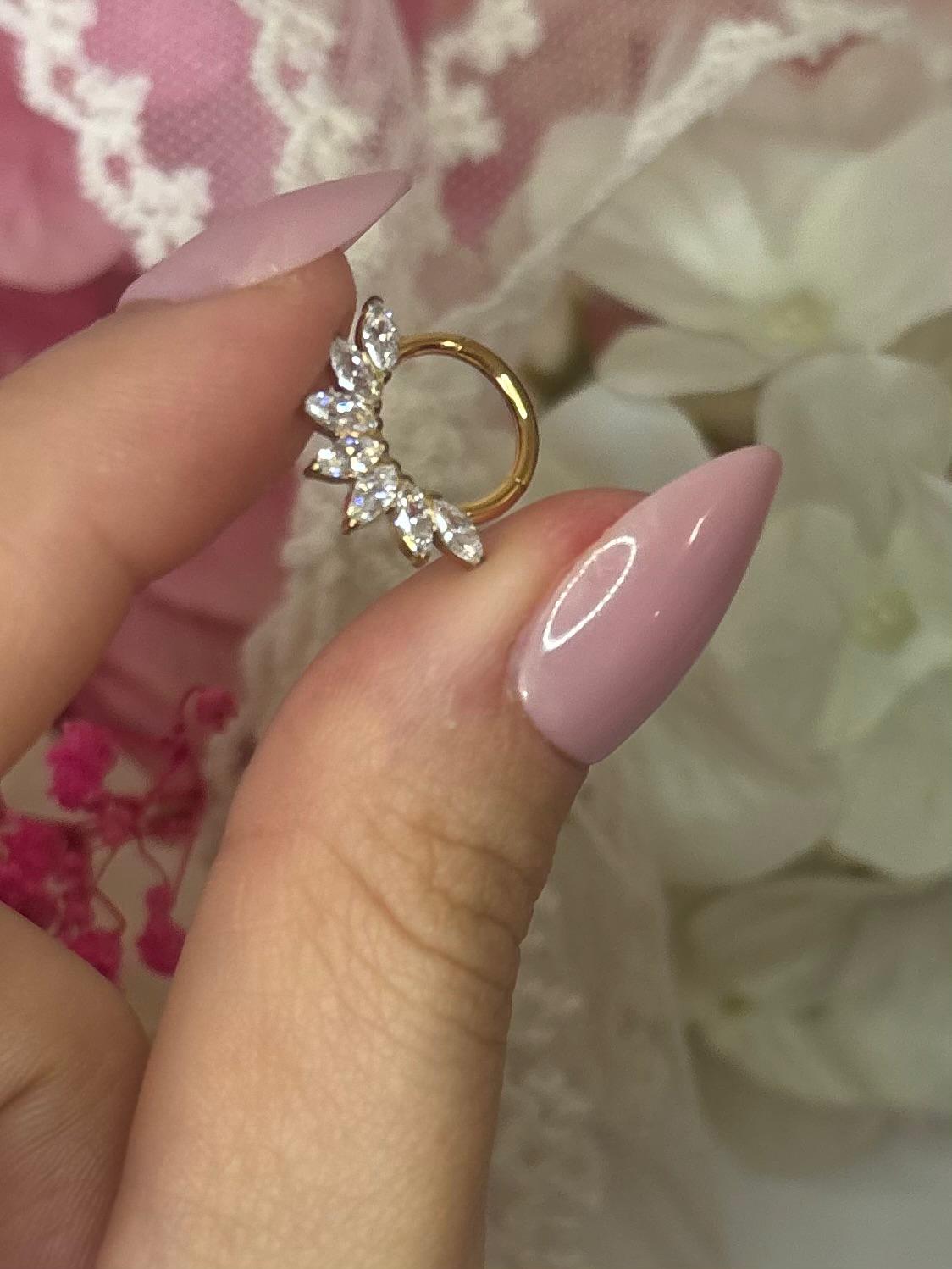 Acest piercing tip inel clicker este realizat din titan premium (ASTM F136), fiind ideal pentru pielea sensibilă și purtare zilnică. Designul său rafinat este evidențiat de un șir de pietre zirconia tip marquise, dispuse în formă de evantai, care oferă un efect spectaculos de strălucire și eleganță.