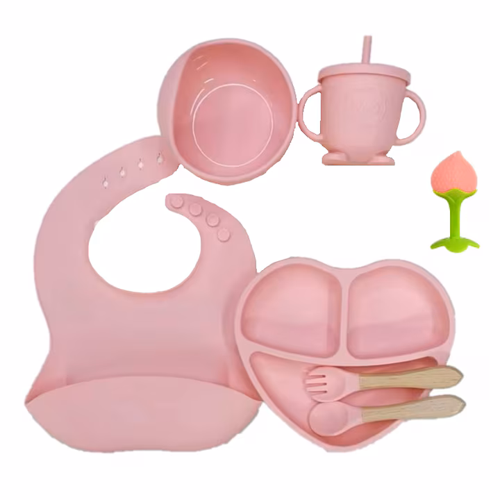 Acesta este un set complet de hranire pentru bebelusi, realizat din silicon alimentar sigur, intr-o nuanta placuta de roz pastel, ideal pentru perioada diversificarii si pentru a sprijini auto-hranirea copilului.