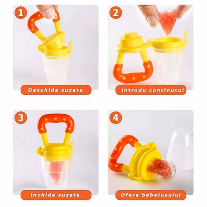 Design sigur si practic – are un recipient din silicon moale, perforat, in care se introduc bucatele mici de fructe, legume fierte, biscuiti sau alte alimente solide.
