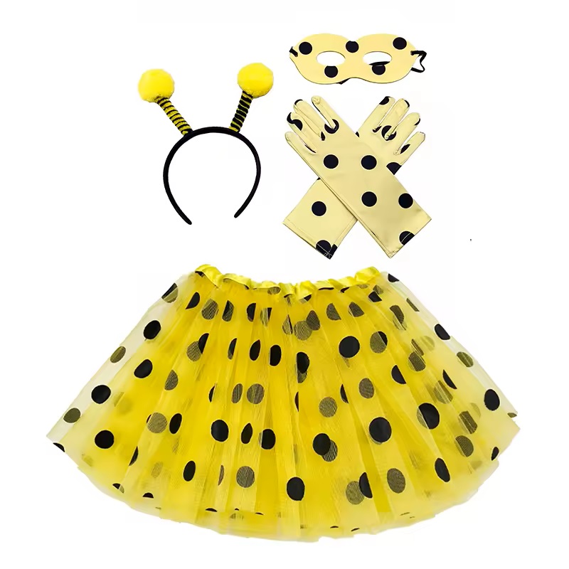 Fustita galbena cu buline negre: Fustita este realizata din material galben transparent, decorata cu buline mari negre, imita stilul clasic al unei albine, aducand o nota vesela si amuzanta.